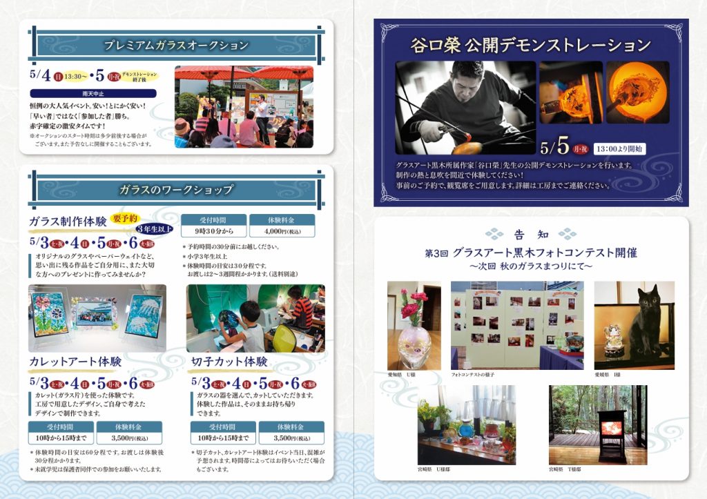 また、切子カット体験やガラス片を使ったカレットアート体験、普段は制作が行われてる現場にて吹きの体験ができる魅力的な4日間となっております。(吹き体験は要予約)