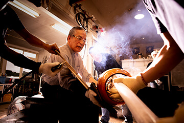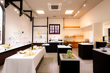 本社ショールームと工房は隣接していますので、作業風景もご覧になれます。 恒例の5月、8月、11月の工房イベントでは、アクセサリーや切子、吹きガラスの制作体験などもご準備しております。ガラスの輝きにあふれたショールームで、 皆様の旅の思い出がいっそう輝きます様に・・。